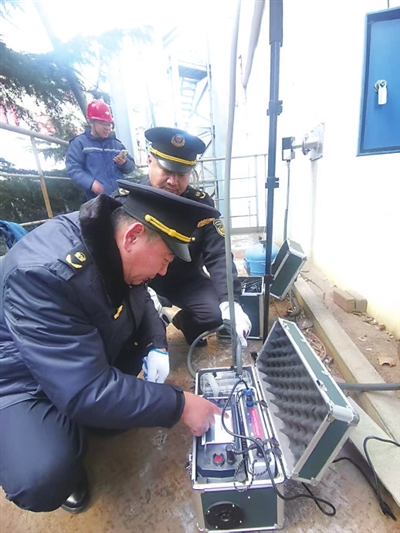 刘明照和葛亮穿上执法制服,收拾好设备就出发了。这些设备,除了三个大箱子,还有一根足有一米多高的“大烟枪”。“这根‘烟枪’,需要插入到烟囱里面,才能采集到废气排放情况。”刘明照表示,监测口一般都设置在离地几米甚至几十米的平台上,每次上下,都要攀爬差不多只容下一人的狭窄楼梯。因此,即使天气再冷,他和同事都不会穿着太厚,以免影响操作。