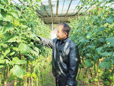 近日,记者走访了娄敬庵村的冬暖大棚。虽然棚外寒风凛冽,棚内却温暖如春。记者看到,圆润的西红柿已经挂满枝头,逐渐成熟,一个个犹如“红灯笼”般次第点亮。种植户刁信令提着大桶,穿梭在与成人差不多高的西红柿行间采摘,不一会儿便装满一大桶。