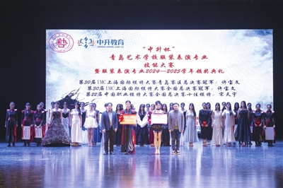 本报1月15日讯 近日,青岛艺术学校“中升杯”服装表演专业技能大赛暨2024—2025学年奖学金颁奖典礼在学校实验剧场举行。现场,40余名参赛学生经过活力秀、西服秀、礼服展示三个环节比拼,经评审共8人获得一等奖。