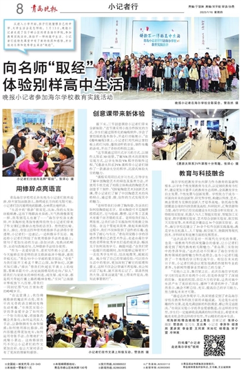 从进入小学开始,孩子们就憧憬自己的中学、大学生活会是怎样的。1月13日,晚报小记者走进了位于崂山区的青岛海尔学校,参加教育实践活动,体验不一样的高中生活。小记者们在特色课堂中有了新的收获和感悟,并分组向名师和优秀学生采访“取经”。