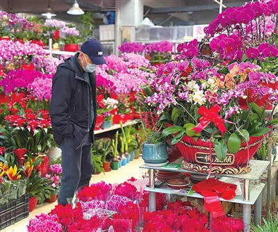 大红、玫红、粉红……红色系的蝴蝶兰花朵硕大饱满,与周边悬挂的中国结、红灯笼相互辉映,浓浓的年味儿扑面而来。“红色的一般20元一盆,还有的30元一盆,价格较往年差不多,略便宜了一点。现在已进入年前热销期了,过年嘛,大家都愿意摆一盆蝴蝶兰增添喜气。”一家花店的老板介绍道。今年卖得最好的依旧是传统的红色系,年轻人喜爱的马卡龙色系也表现不俗,粉蓝、粉红、粉紫等色彩鲜明的马卡龙色蝴蝶兰,以其独特的色调受到年轻顾客的青睐。这些充满活力与时尚感的颜色,为传统的年宵花市场增添了一抹别样的青春色彩。