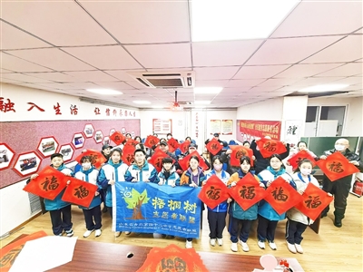 青岛42中梧桐树志愿者团队进社区送“福”字。学校供图