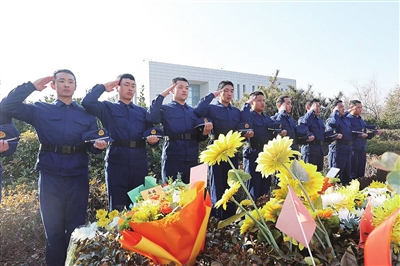 消防员们向烈士致敬。
