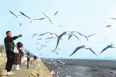 学生们在志愿者带领下,观察海鸥觅食的场景。文明办供图