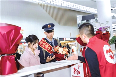 在青岛西站“荣归”返乡接待站,工作人员第一时间为返乡退役士兵披上绶带、佩戴红花,并发放《荣归返乡攻略》。在“荣归”返乡欢迎活动现场,工作人员耐心向退役士兵介绍“智慧荣军”退役军人综合服务平台的使用方法,让他们能够更便捷地获取各类服务资源,实现业务“掌上办、指尖办”。“之前退役士兵返乡后需要到服务站办理的几十项服务,现在通过一部手机就能实现,登录‘智慧荣军’平台点击‘退役军人服务模块’,就可以看到‘退役一件事’‘我要就业创业’等功能选项,各项服务应有尽有,非常便捷。”退役士兵陈帅男说。