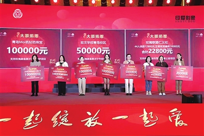 在大额捐款和慈善拍卖环节,70多件收藏家、艺术家及爱心人士捐赠的宝物被现场接拍,山东易飞商旅信息技术有限公司、青岛福柏眼科医院、交银国际信托有限公司、青岛Moi名钻坊珠宝、宏文学校青岛校区、玫瑰联盟仁义社、爱基金等现场举牌进行大额捐款,共筹集善款100余万元,将全部用于玫瑰基金英才少年助学、粉红丝带救助等公益项目。