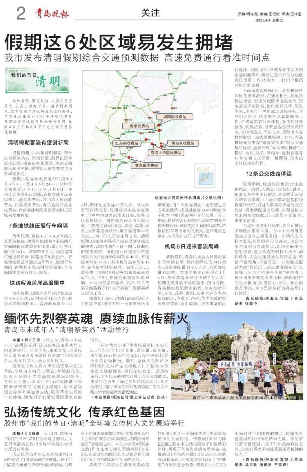 春和景明、繁花绽放,人间四月芳菲天,正是出游好时节。清明假期到来,我市交通口岸也将迎来出行高峰,市交通运输局对2025年清明假期青岛市综合交通运行数据进行预测,提醒4日上午和6日下午这些地方易出现拥堵。