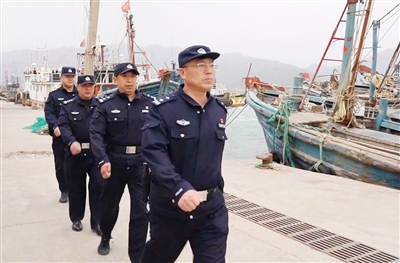 青岛市公安局海岸警察支队王哥庄派出所民警在码头巡逻。 吴忠林 摄