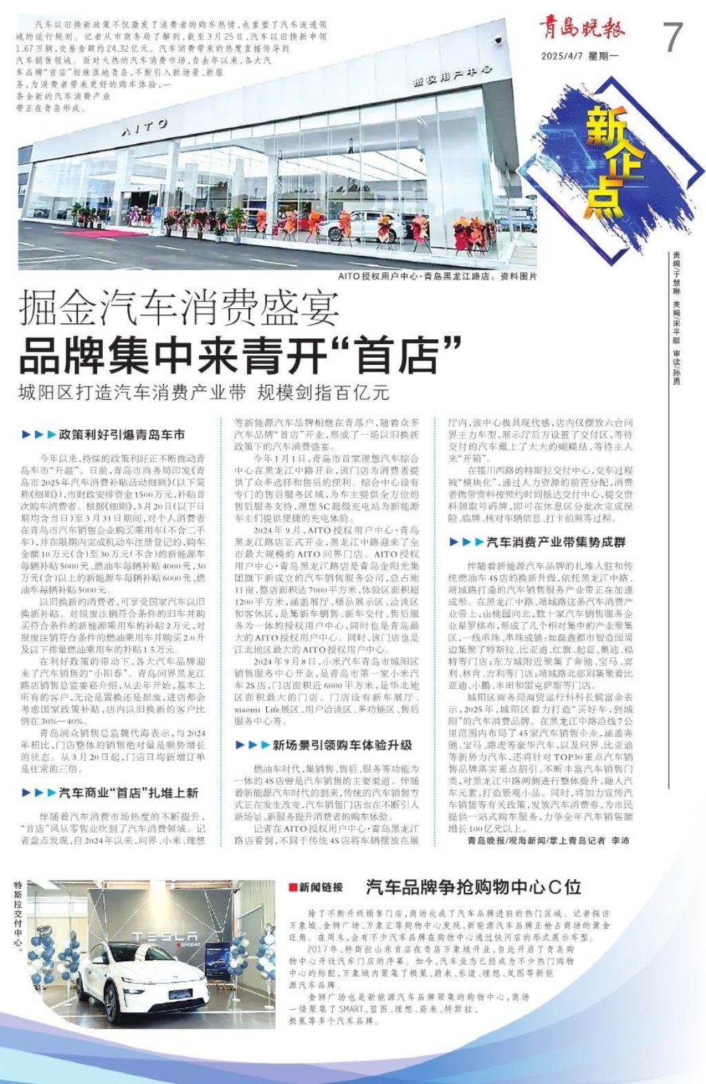 城阳区商务局商贸运行科科长候富余表示,2025年,城阳区着力打造“买好车,到城阳”的汽车消费品牌。在黑龙江中路沿线7公里范围内布局了45家汽车销售企业,涵盖奔驰、宝马、路虎等豪华汽车,以及问界、比亚迪等新势力汽车,还将针对TOP30重点汽车销售品牌落实重点招引,不断丰富汽车销售门类,对黑龙江中路两侧进行整体提升,融入汽车元素,打造景观小品。同时,将加力宣传汽车销售等有关政策,发放汽车消费券,为市民提供一站式购车服务,力争全年汽车销售额增长100亿元以上。