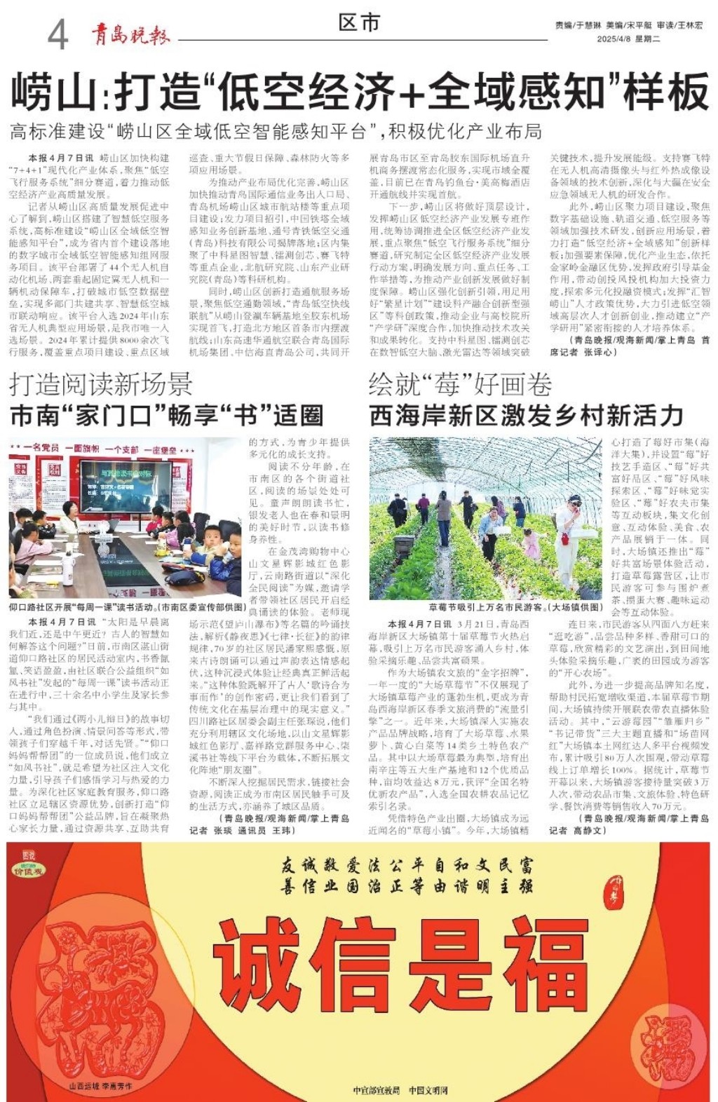 本报4月7日讯 崂山区加快构建“7+4+1”现代化产业体系,聚焦“低空飞行服务系统”细分赛道,着力推动低空经济产业高质量发展。