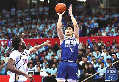 季后赛首战,青岛球员王睿泽(右)在比赛中投篮。