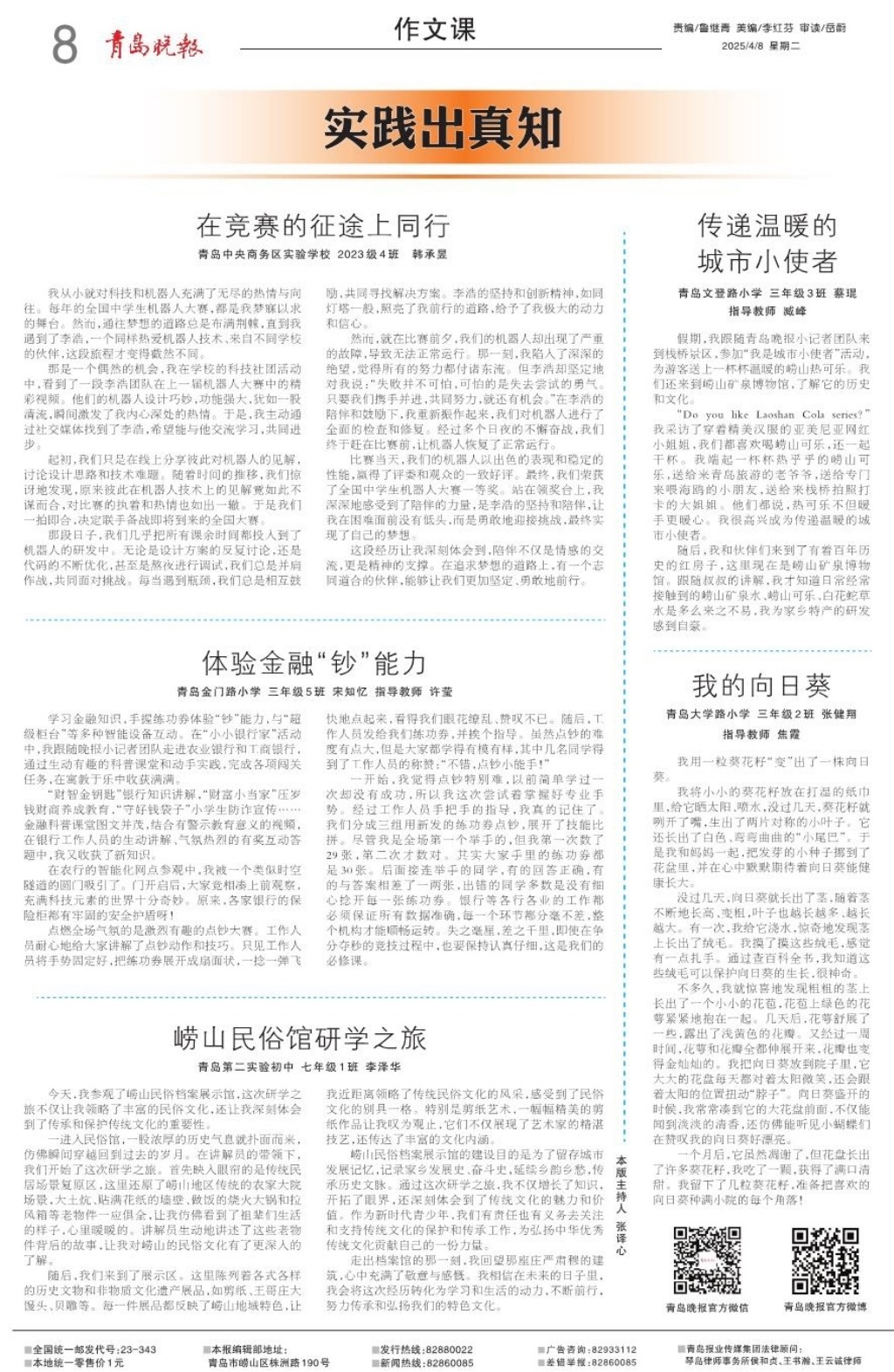 A01 头版 A02 关注 A03 青岛故事 A04 区市 A05 城事 A06 综合 A07 青潮 A08 作文课