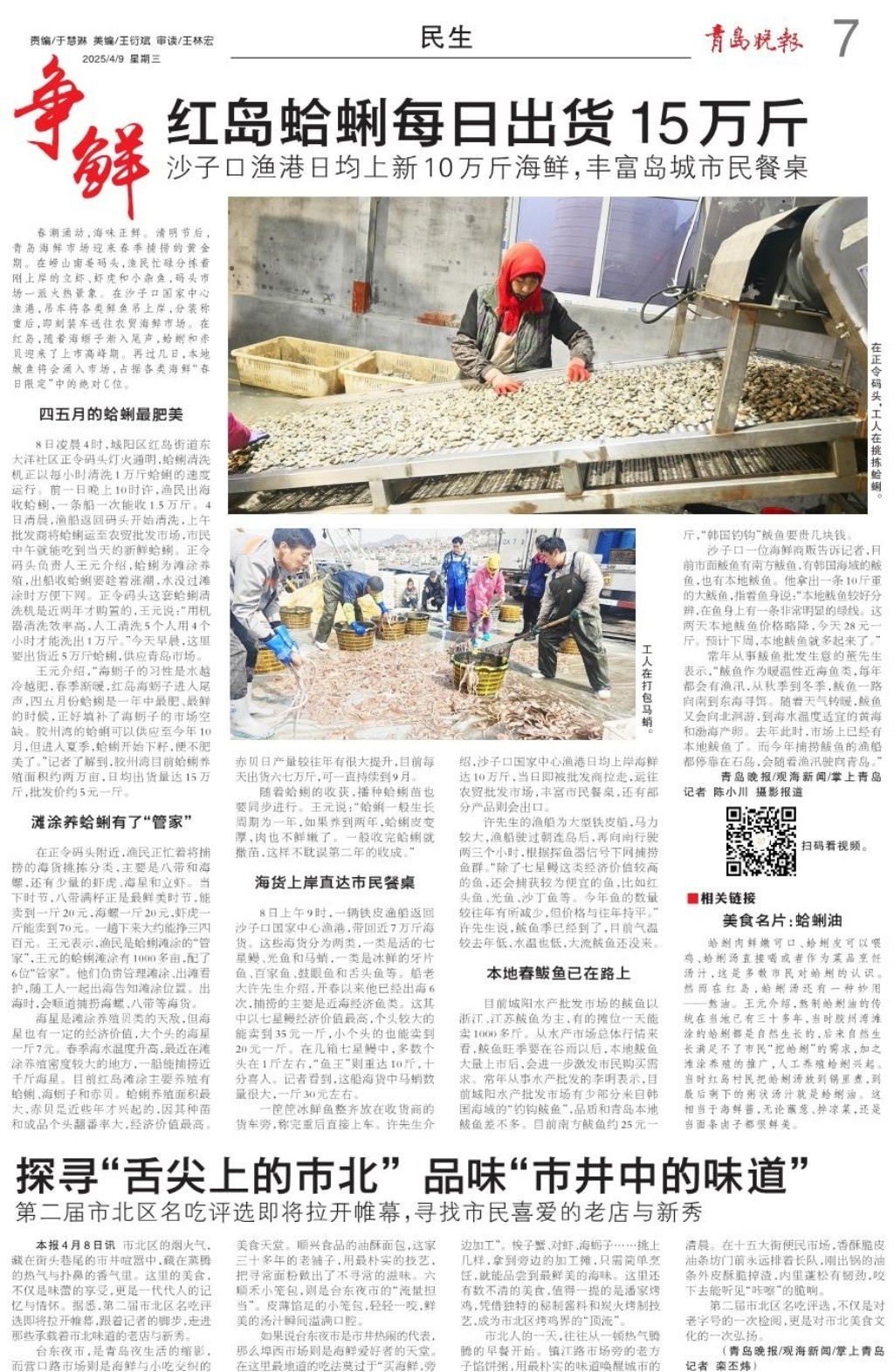 春潮涌动,海味正鲜。清明节后,青岛海鲜市场迎来春季捕捞的黄金期。在崂山南姜码头,渔民忙碌分拣着刚上岸的立虾、虾虎和小杂鱼,码头市场一派火热景象。在沙子口国家中心渔港,吊车将各类鲜鱼吊上岸,分装称重后,即刻装车送往农贸海鲜市场。在红岛,随着海蛎子渐入尾声,蛤蜊和赤贝迎来了上市高峰期。再过几日,本地鲅鱼将会涌入市场,占据各类海鲜“春日限定”中的绝对C位。