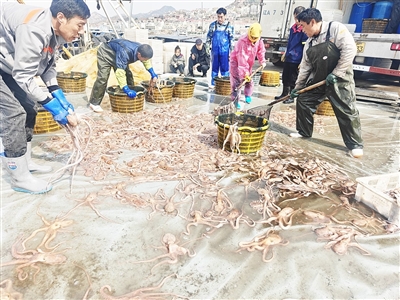 一筐筐冰鲜鱼整齐放在收货商的货车旁,称完重后直接上车。许先生介绍,沙子口国家中心渔港日均上岸海鲜达10万斤,当日即被批发商拉走,运往农贸批发市场,丰富市民餐桌,还有部分产品则会出口。