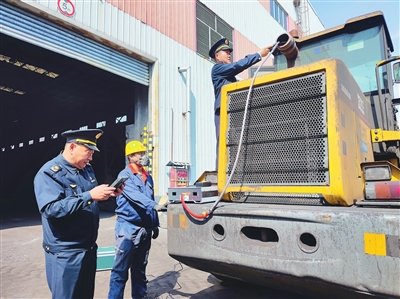 供暖虽已结束,但位于辽阳东路附近的高科热力公司,储煤场内仍有铲车在往返作业,把煤堆推平以保障安全。作为非道路移动机械的一种,这台铲车的污染物排放是否达标?11日上午,市生态环境综合行政执法支队崂山大队四中队负责人叶庆春和市生态环境局崂山分局监测科负责人刘明照一起,拎着二十多公斤重的监测设备,走进高科热力开展非道路移动机械的尾气采样。“这台仪器是不透光烟度计,通过将采样口插入车辆排气口,来监测尾气排放中的烟气黑度情况。”现场,刘明照和叶庆春分工有序,调试好设备后,叶庆春顾不得铲车扶手上的煤灰,直接爬了上去,随后便开始了采样监测。