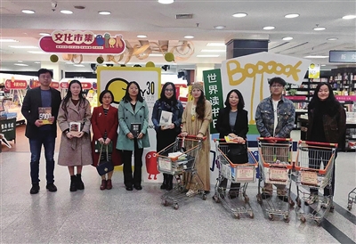 作家阿占(左五)、高伟(左六)、艾玛(左七)在书城引领读者选书。