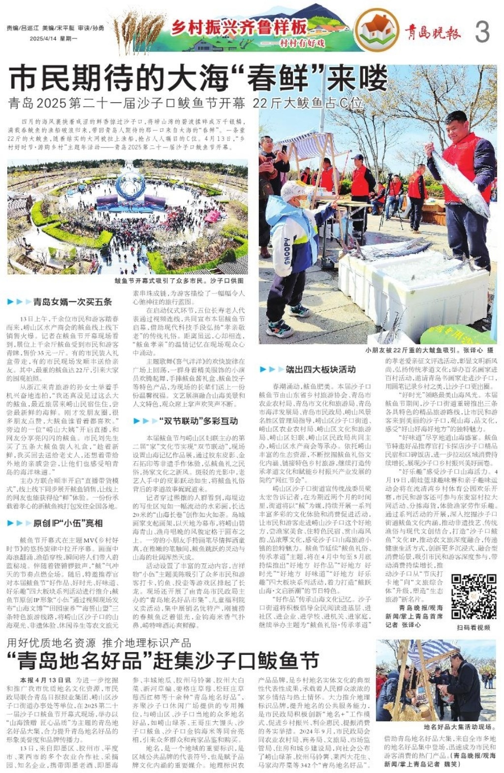 “好乐趣”感受沙子口山海活力。4月19日,萌娃篮球趣味赛和亲子趣味运动会将在流清湾乡村体育公园欢乐开赛,市民和游客还可参与东麦窑村拉大网活动、分拣海货,体验渔家劳作乐趣。通过系列活动的开展,深入挖掘沙子口街道鲅鱼文化内涵,推动非遗技艺、传统渔俗与现代文创结合,打造“沙子口鲅鱼”文化IP,推动农文旅深度融合,传递健康生活方式,创新更多沉浸式、融合型消费场景,吸引市民和游客深度参与,带动消费持续增长,推动沙子口从“节庆打卡地”向“文旅综合体”升级,塑造“生态旅游”新名片。