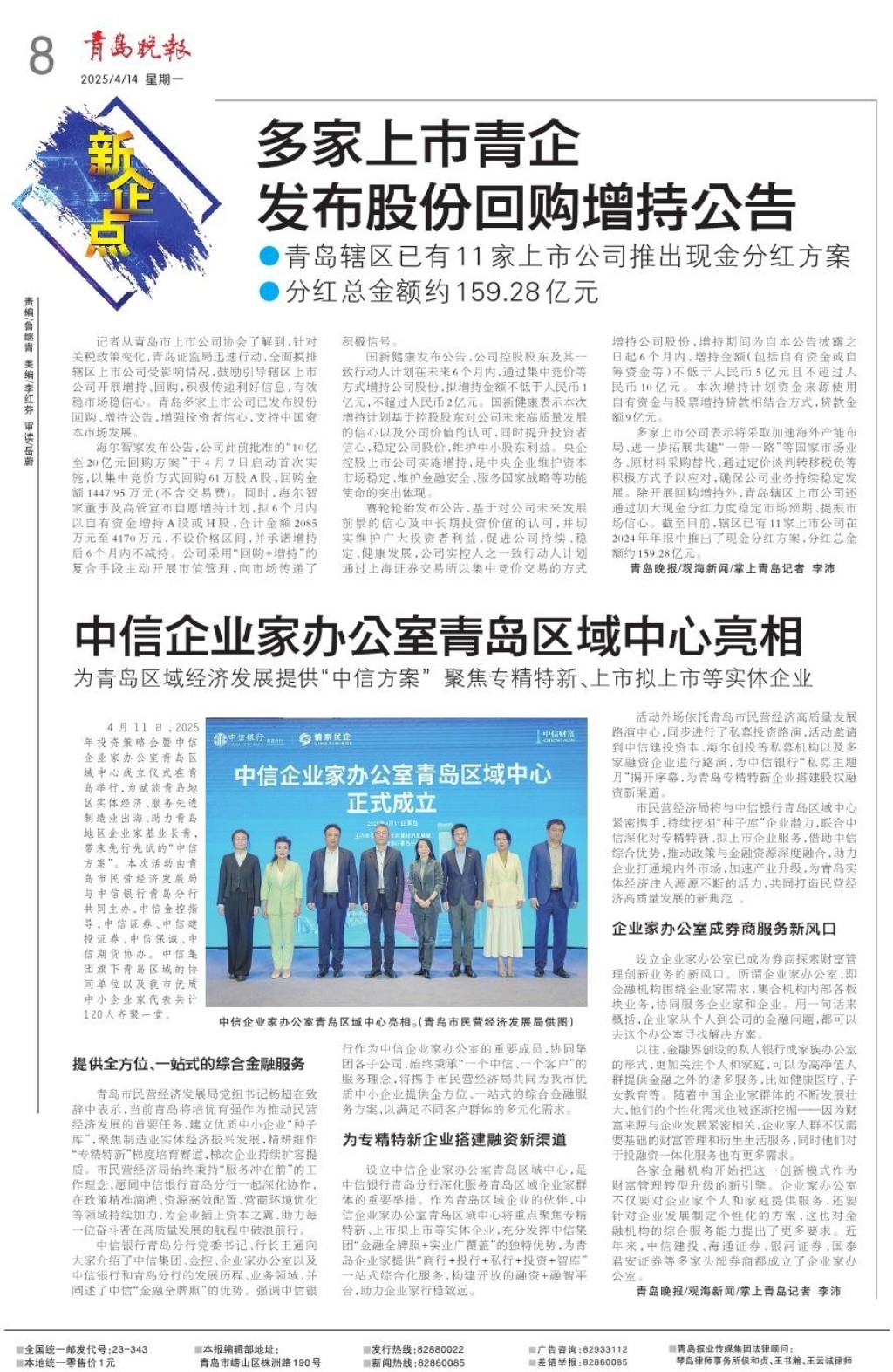 多家上市公司表示将采取加速海外产能布局、进一步拓展共建“一带一路”等国家市场业务、原材料采购替代、通过定价谈判转移税负等积极方式予以应对,确保公司业务持续稳定发展。除开展回购增持外,青岛辖区上市公司还通过加大现金分红力度稳定市场预期、提振市场信心。截至目前,辖区已有11家上市公司在2024年年报中推出了现金分红方案,分红总金额约159.28亿元。