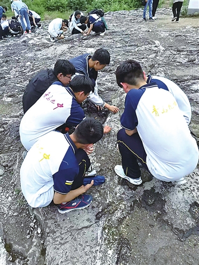 青岛九中学子在地质考察研学中观察岩石。(学校供图)