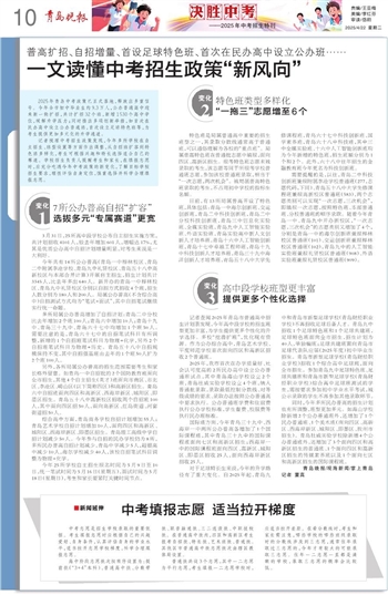 记者梳理中考招生政策发现,今年多所学校在自主招生、班型设置等方面作出调整,从自招班扩容到特色班多样化,考生可根据兴趣和特长选择适合自己的赛道。学校招生负责人提醒考生和家长,在填报志愿时,应充分吃透今年中考政策的新变化,了解目标学校招生要求,理性评估自身定位,慎重选择并科学合理填报志愿。