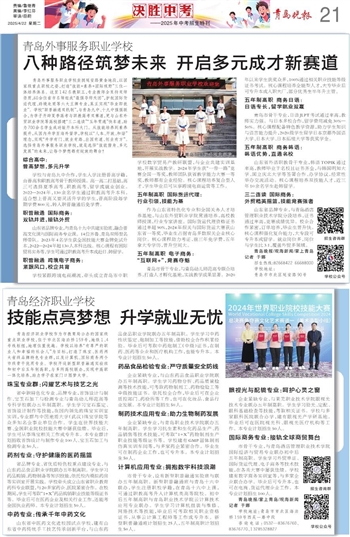 学校与青岛九中合作,学生入学注册普高学籍,由普高和职教高考骨干教师授课。高一高二打基础,高三可选择夏季高考、职教高考、留学或就业创业。2022—2024年,130余名学生通过职教高考升本科。适合想上普高又要灵活升学的学生,普高阶段每学期学费800元,转入职普融通后免学费。