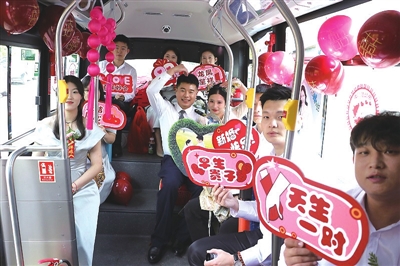车身装饰着新人婚纱照与彩带,车头挂着大红喜字。10日上午,新郎、501路驾驶员朱琛琛驾驶一辆“宝宝巴士”,缓缓驶入沙子口街道大河东村,迎娶心上人、公交调度员曲晓彤。“今天终于开‘宝宝巴士’娶到我心爱的女孩啦!”这对双双就职公交集团的新人用“公交车接亲”的方式,圆了自己的婚礼之梦,诠释别样的浪漫和幸福。“我们希望借此能够传递低碳生活的理念,让‘宝宝巴士’作婚车成为一种时尚。”曲晓彤说 。