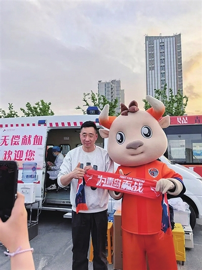 5月17日下午,青岛青春足球场西北广场突发奇观:当献血车撞上绿茵场,青岛海牛足球俱乐部跟球迷精彩配合,上演“热血足球”,连一头可爱的牛牛都躁动了。