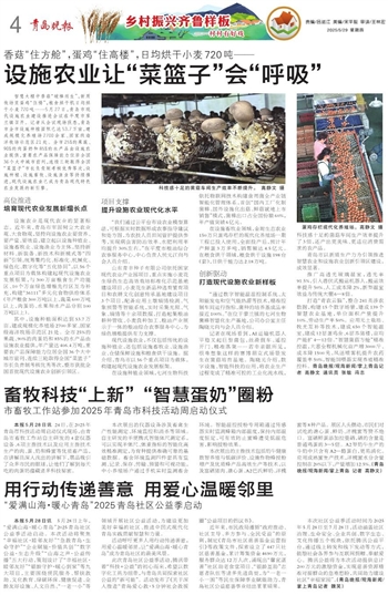 智慧大棚中香菇“破棒而生”,新质牧场里蛋鸡“住楼”,粮食烘干机日均烘干小麦720吨……5月27日,青岛市现代设施农业建设推进会议在平度市蓼兰镇召开。记者从会议现场获悉,青岛市全市设施种植面积已达53.7万亩,建成规模化养殖场2700余家、国家级海洋牧场示范区21处。全市25%的果蔬、90%的肉蛋奶和85%的水产品由设施农业提供,重要农产品保障能力位居全国36个大中城市前列,连续三轮取得全国“菜篮子”市长负责制考核优秀等次,设施种植、设施畜牧、设施渔业等持续推进,现代设施农业已成为青岛现代特色农业发展的新引擎。