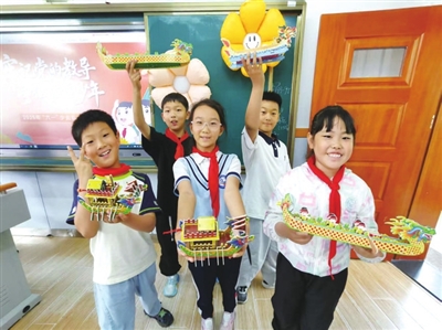 学校开展“我的六一我做主”小调研,倾听队员的意见和建议,精心策划他们喜欢的活动,科技秀、才艺秀、美食秀、民俗秀等创意十足的活动让队员们度过难忘的节日。有的孩子在老师的带领下,用扭扭棒编织出队徽的图案,送上美好祝福;有的孩子通过龙舟DIY、编彩绳、画端午扇等体验,感受中华民族传统节日的魅力;有的孩子开展美食DIY,感悟劳动创造幸福的意义;有的载歌载舞,通过才艺秀展示庆祝节日……
