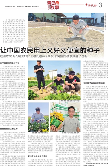 种子是农业“芯片”。2016年,毕业于美国林肯大学的90后青年王棋,放弃海外发展机会回到家乡胶州,创办青岛靓品农业科技发展有限公司。9年间,他带领团队陆续研发出62个具有自主知识产权的蔬菜品种,其中,研发的青梗菜种子,打破日本种企长期垄断市场的局面。建成种子生产基地3000余亩,带动周边上千农户增收。从“海归青年”到“育种先锋”,王棋用一粒粒“中国芯”种子,书写新时代青年扎根农业、赋能乡村振兴的故事。