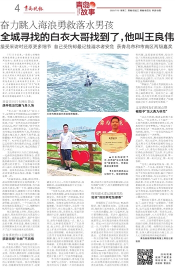 7月12日以来,一段惊心动魄的视频在网络上牵动着青岛乃至全国网友的心:在燕岛山公园附近海湾,一名男孩在汹涌波涛中挣扎沉浮,情况危急。千钧一发之际,一个白色身影冲破风浪阻隔,奋力扑向溺水男孩,最终将其从死亡边缘拉回。这位白衣大哥的义举迅速引发青岛“全城寻人”的热情。当身份揭晓,大家发现他是来自上海的游客王良伟。14日,记者辗转采访到这位“平凡”的英雄,听他还原见义勇为背后的更多细节,记录下他的纵身一跃为何被青岛铭记,以及这座城市又怎样用荣誉致敬这份跨越地域的凡人义举。