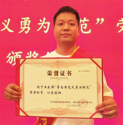 ▲王良伟被授予市、区两级“见义勇为模范”荣誉称号。市南区委政法委供图