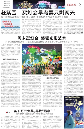 2025年“青岛之夏”艺术灯会自7月18日开幕,已有20余万人次在光与影的梦幻奇境中体会夏日休闲的乐趣。记者8月8日自灯会举办方了解到,29.9元的早鸟票销售将于10日结束,新一轮的票务政策将于11日启动。