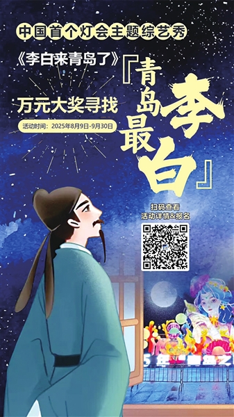 希望通过《李白来青岛了》这个活动,让更多人爱上中国传统文化,感受“青岛之夏”艺术灯会和青岛这座城市的魅力。报名时间:8月9日至9月30日。扫描右侧图中二维码即可报名。