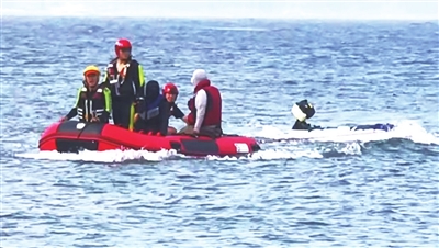 救援人员立即驾驶冲锋舟,破浪驶向目标海域。经过30多分钟不懈的紧张搜寻,救援人员终于发现了目标——两名男子正无助地坐在随波摇摆的皮划艇上。