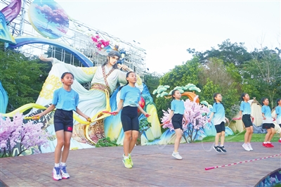 胸前环绕、单抬腿跳、三连跳、双人大合跳……昨晚,青岛市跳绳运动协会的9名花样跳绳小将来到2025年“青岛之夏”艺术灯会现场,为观众展示精彩的花样跳绳表演。一系列高难度的精彩动作,引起台下观众的阵阵掌声。前不久在青少年跳绳世锦赛打破世界纪录的曹馨月现场展示“马达”绝技,将跳绳在空中摇出“幻影”。