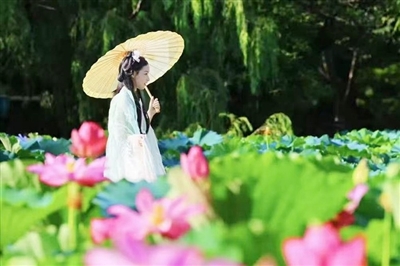 位于中山公园西南角的小西湖,眼下荷叶如叠翠的玉盘,密密匝匝铺满湖面。荷花自层层绿浪中挺身而出,有的全然绽放,有的犹抱含苞,花瓣从深至浅渐次晕染,粉白相间,宛如少女含羞。不少摄影爱好者沿木曲桥漫步,或驻足湖心亭,用镜头捕捉这静谧浪漫的瞬间。“每年这个时候我都会和朋友来拍照,就像和小西湖有一个不变的约定。”家住市北区的徐女士告诉记者,今年“青岛之夏”艺术灯会人气很旺,她早早购票,计划赏荷、逛灯会一举两得。
