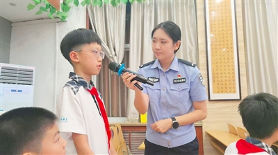因为课程的主要内容是“网络安全”,小学生们举手提问时,大数据、AI换脸、屏幕共享等词语频繁出现。为此,李研早有准备。她的安全课不同于传统的“照本宣科”,她结合日常工作中处置过的未成年人被诱骗刷礼物、赠送主角装备和“皮肤”骗局、网上陌生人员搭讪等真实案例,用“讲故事+情景模拟” 的方式,拆解防范网络诈骗、网络暴力等安全知识点。“如果陌生人说‘加微信可低价换游戏皮肤’,该做什么?”她抛出问题后,学生们纷纷举手抢答,课堂气氛热烈。对于回答正确的小学生,李研给他们送上了市南分局的文创纪念品。