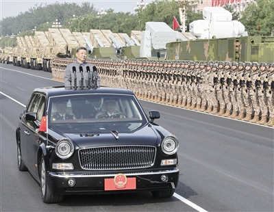 9月3日,纪念中国人民抗日战争暨世界反法西斯战争胜利80周年大会在北京天安门广场隆重举行。这是中共中央总书记、国家主席、中央军委主席习近平检阅受阅部队。