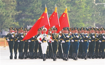 ▲仪仗方队护卫党旗、国旗、军旗,3日上午第一个走过天安门广场,接受祖国和人民检阅。