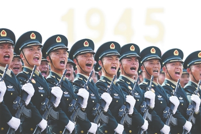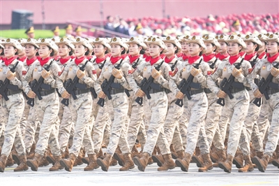 ▲3日上午,民兵方队走过天安门广场,接受祖国和人民检阅。民兵方队全部由女民兵组成。这是民兵首次亮相以纪念抗战胜利为主题的阅兵活动。