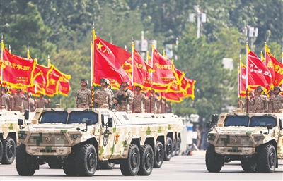 ◀3日上午,80面抗战英模部队荣誉旗帜组成的战旗方队,承载着历史荣光,接受祖国和人民检阅。