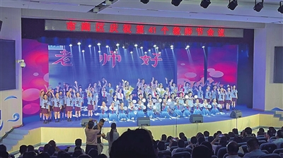 庆祝会议上,区教体系统师生举行了“弦歌不辍育桃李,躬耕杏坛沁芳华”文艺演出。旋律响起,教师、学子们化作追光者翩跹起舞《你从光中走来》,《一条大河》的表演者们以动人舞姿展现师者胸中千顷澄碧,京剧《东方辉煌》唱念做打间皆是文化传承的注脚,光影剧《奋斗成就最美的芳华》勾勒出教师们躬耕教坛、潜心育人的生动剪影……整场演出为师生代表在讲台之外搭建起一个才情绽放的新舞台,掌声如潮,高潮迭起。