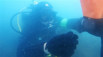 9月15日上午10时许,天空中的云朵散去,太阳直射在八大峡附近海面。在离岸数十米的海上,一艘红色的橡皮艇上,坐着四名潜水员。随着指挥员一声令下,四人几乎同时后仰,随后潜入水中。