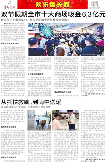 本报10月9日讯 国庆中秋假期,市商务局发挥市提振消费工作机制办公室统筹协调作用,围绕“礼惠金秋”消费季,以“家国同庆、月圆琴岛”为月度主题,组织各区市、商超综合体、步行街等,谋划开展100余场促消费活动,融合“商旅文体健展”多元业态,持续优化消费供给,释放消费潜力。监测显示,假期全市十大重点商贸监测企业(集团)实现销售额6.3亿元,较去年同期增长6.4%。