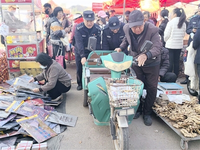 派出所民警帮忙推车,疏导大集内部的交通。