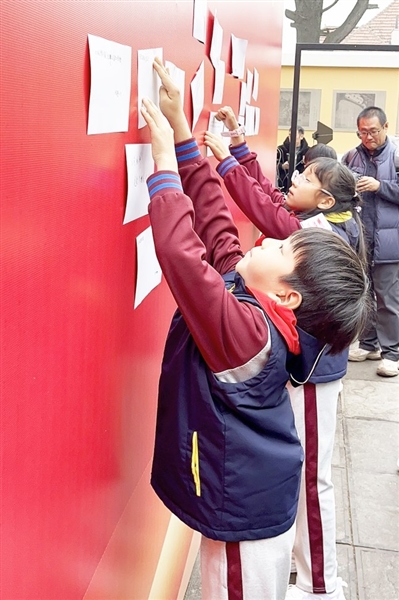学生们将写给历史名人的信贴到背景板上,表达追思敬仰之情。