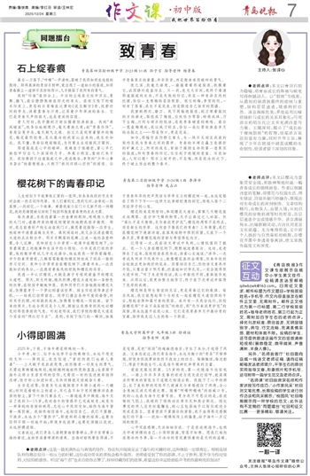 《青岛晚报》作文课专版展示岛城中小学生美文佳作,投稿请发送至邮箱qdwbzwk@163.com。日常征文要求:邮件标题为作文题目+学校班级姓名+手机号,作文内容直接发在邮件正文里,无需附件。邮件正文格式为第一行标题,第二行学校班级姓名+指导老师姓名,第三行起为正文,需附加百字左右的老师点评。择优刊发标准:原创首发,无明显错别字、病句,行文流畅,充满真情实感,题材和体裁不限。投稿的学生,还可提供朗读这篇作文的竖版清晰短视频(画面稳定,面带微笑,声音清晰,半身人像)。