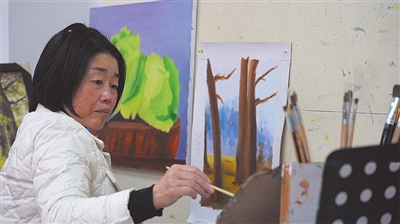 拿起画笔的村民黄秀芹在工作室画画。