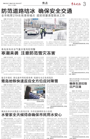 本报1月18日讯 18日,记者从青岛市生态与农业气象中心、青岛市农业技术推广中心了解到,受强冷空气持续影响,1月18日至22日,我市有寒潮天气,18日夜间起气温持续下降,全市过程平均降温幅度10~12℃,最低气温出现在22日早晨,最低气温沿海地区-10℃左右,北部内陆地区-13℃~-10℃。18日至19日有中到大雪,农业生产谨防强降雪、大风和低温冻害。